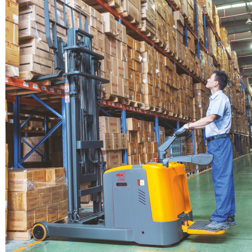 ■承載能力可達1噸。站人平臺起升高度1.2米。方便高層貨架貨物的裝卸和揀選工作。站人平臺前部配有小置物架可承載60kg左右的輕便貨物。EPS電子轉向系統(tǒng)加上自主研發(fā)設計的轉向舵
