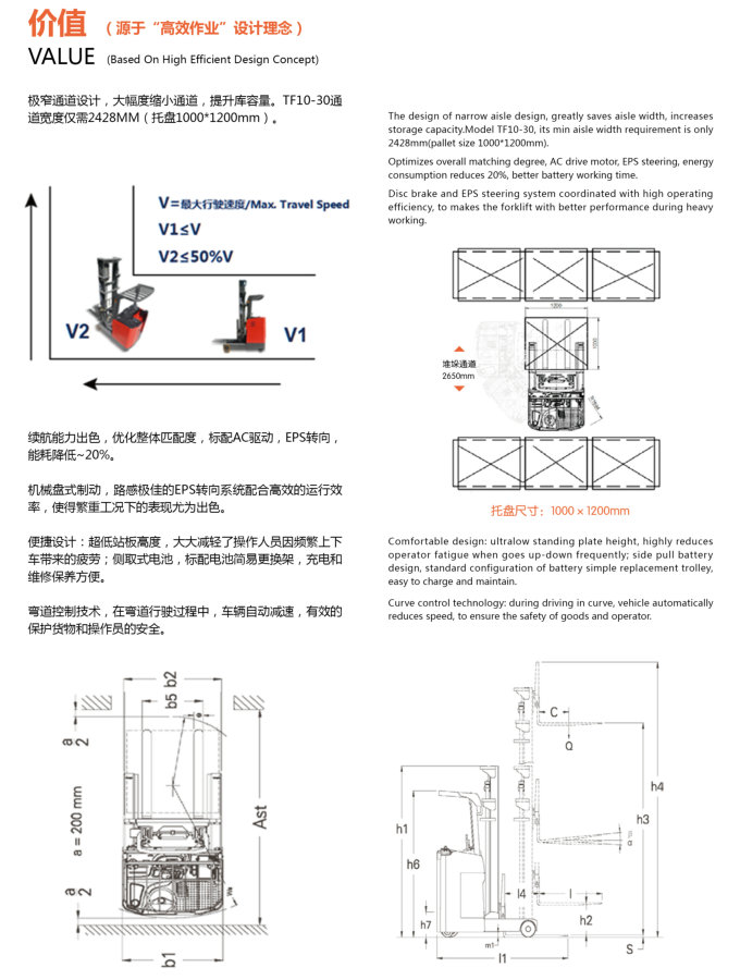 11.  整車轉(zhuǎn)彎半徑為1480mm,以1200×1200mm托盤為例,在保證200mm安全距離的前提下,其最小堆垛通道寬度為2630mm,在窄巷道載貨作業(yè)上具有很大的優(yōu)勢。